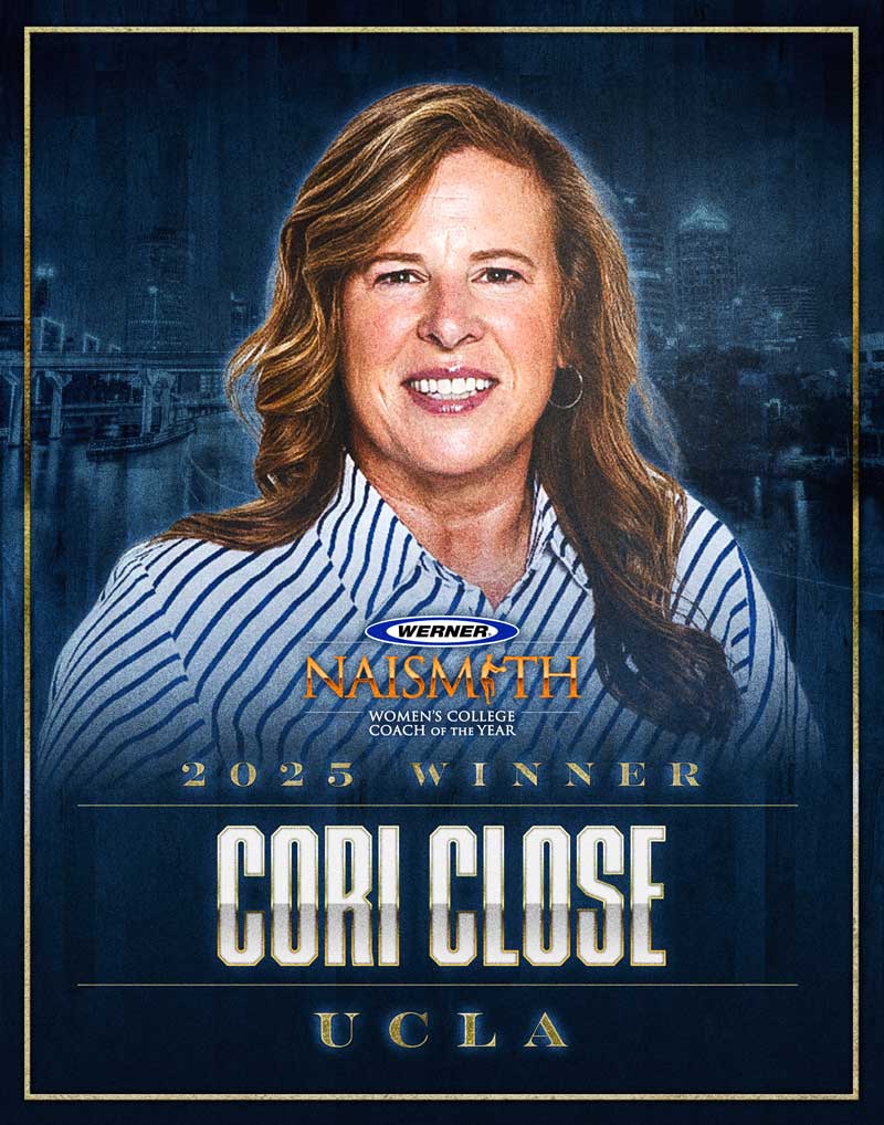 UCLA’s Cori Close is the 2025 Werner Ladder Women’s Coach of the Year award. She becomes the first female coach from UCLA to win a Naismith Award (four players and one coach have combined for seven men’s awards). The other 2025 finalists were Mark Campbell from TCU, Southern California’s Lindsay Gottlieb and South Carolina’s Dawn Staley.